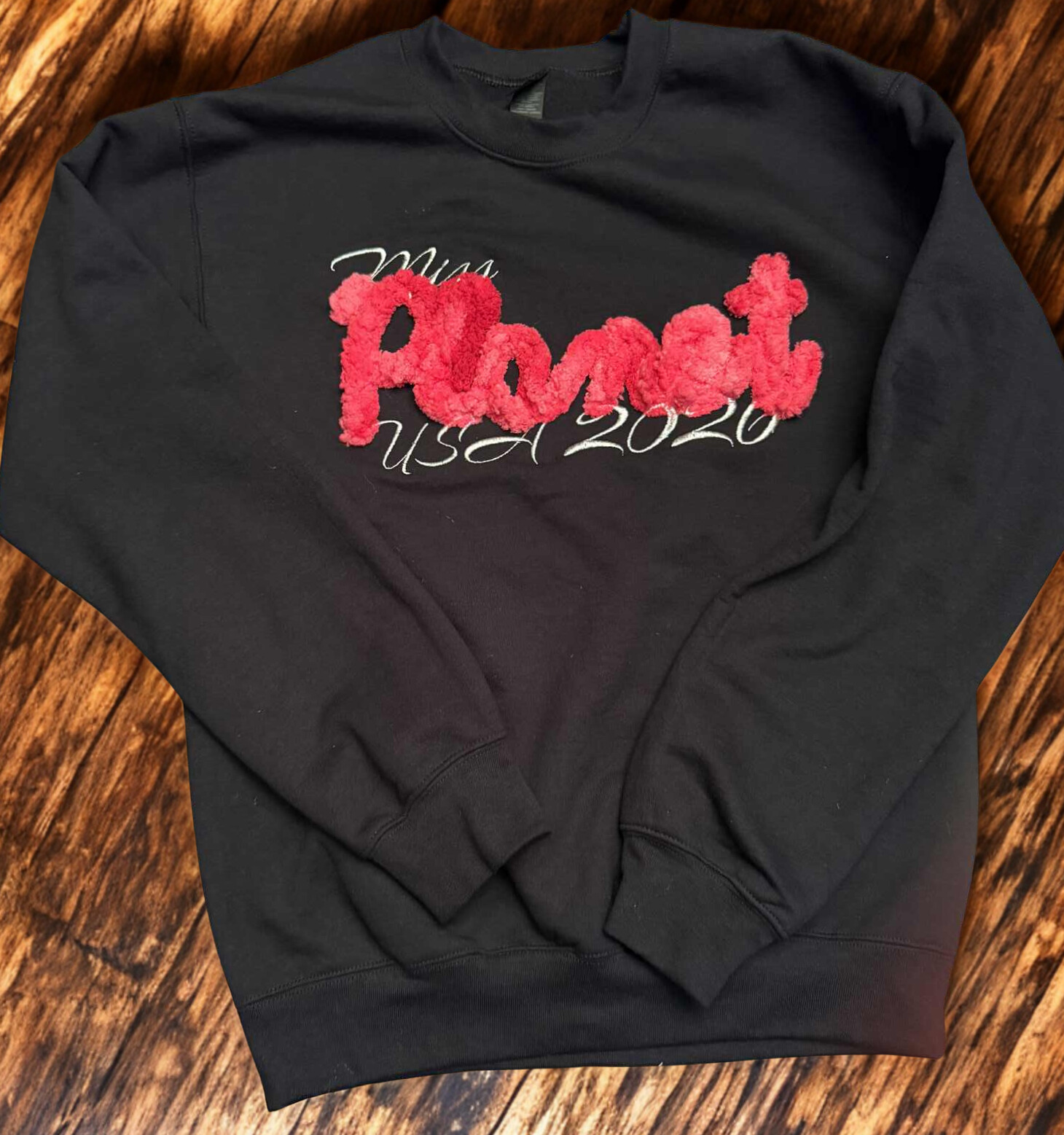 Chenille Yarn features your title, pageant name or state/province/country in super fluffy chenille yarn on the front. You can choose the color of the yarn feature as well as the contrasting embroidery color for the rest of your title.
