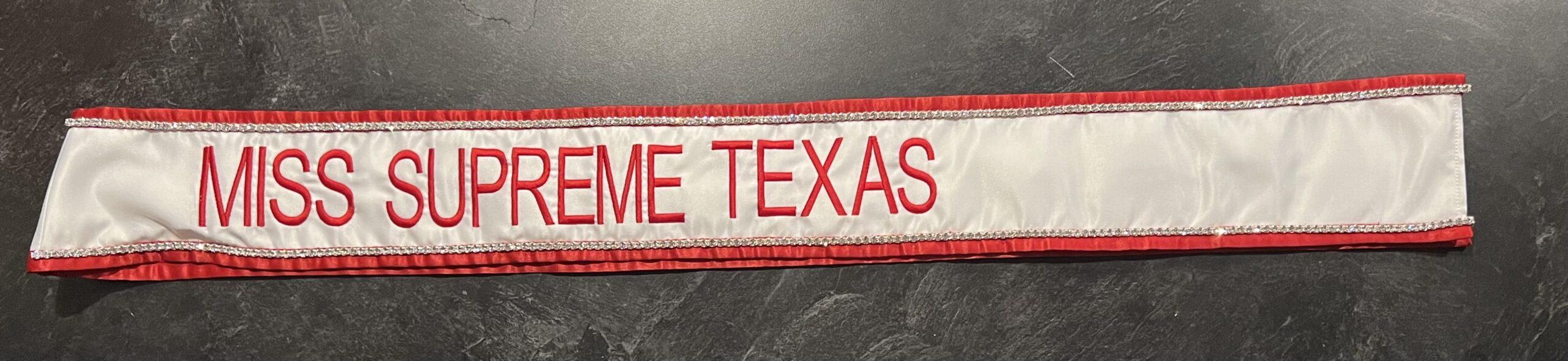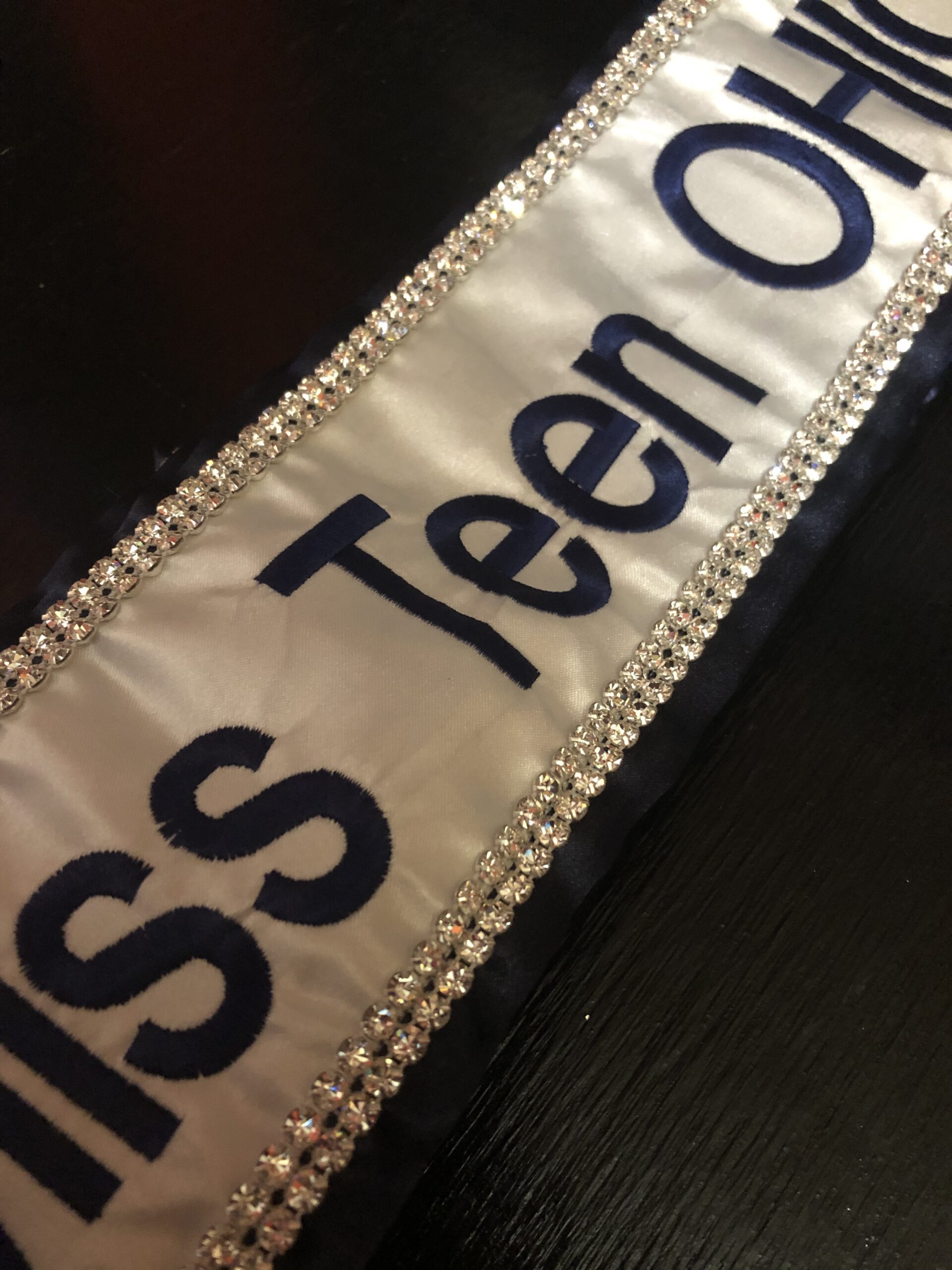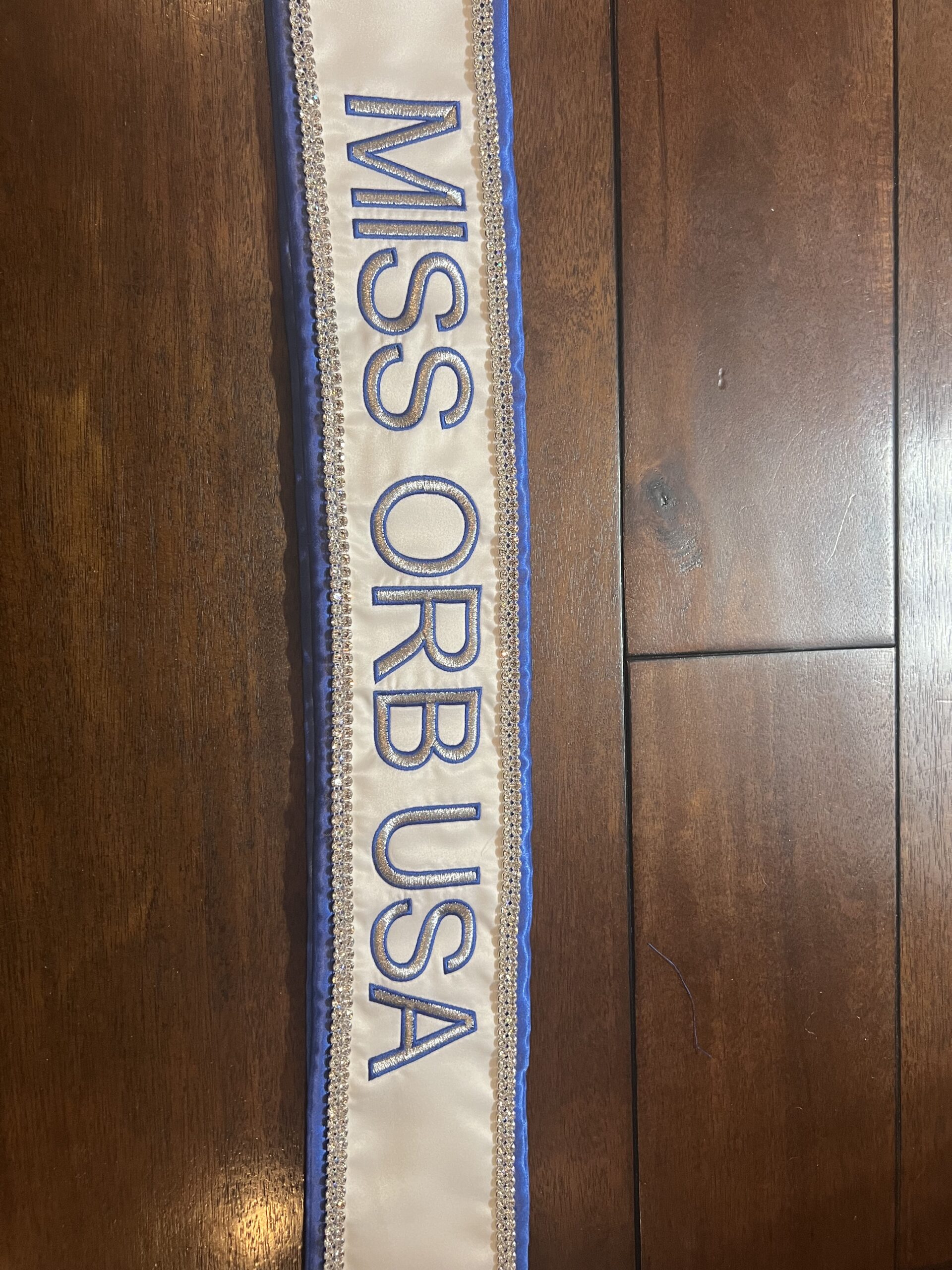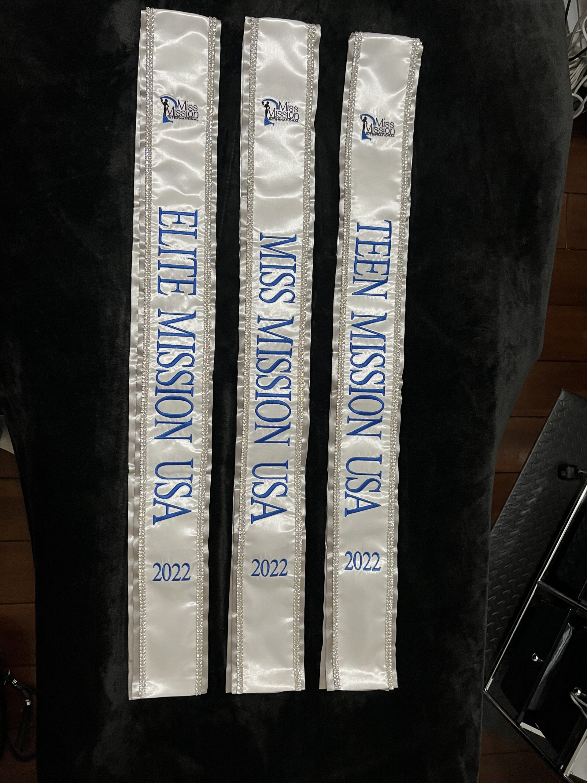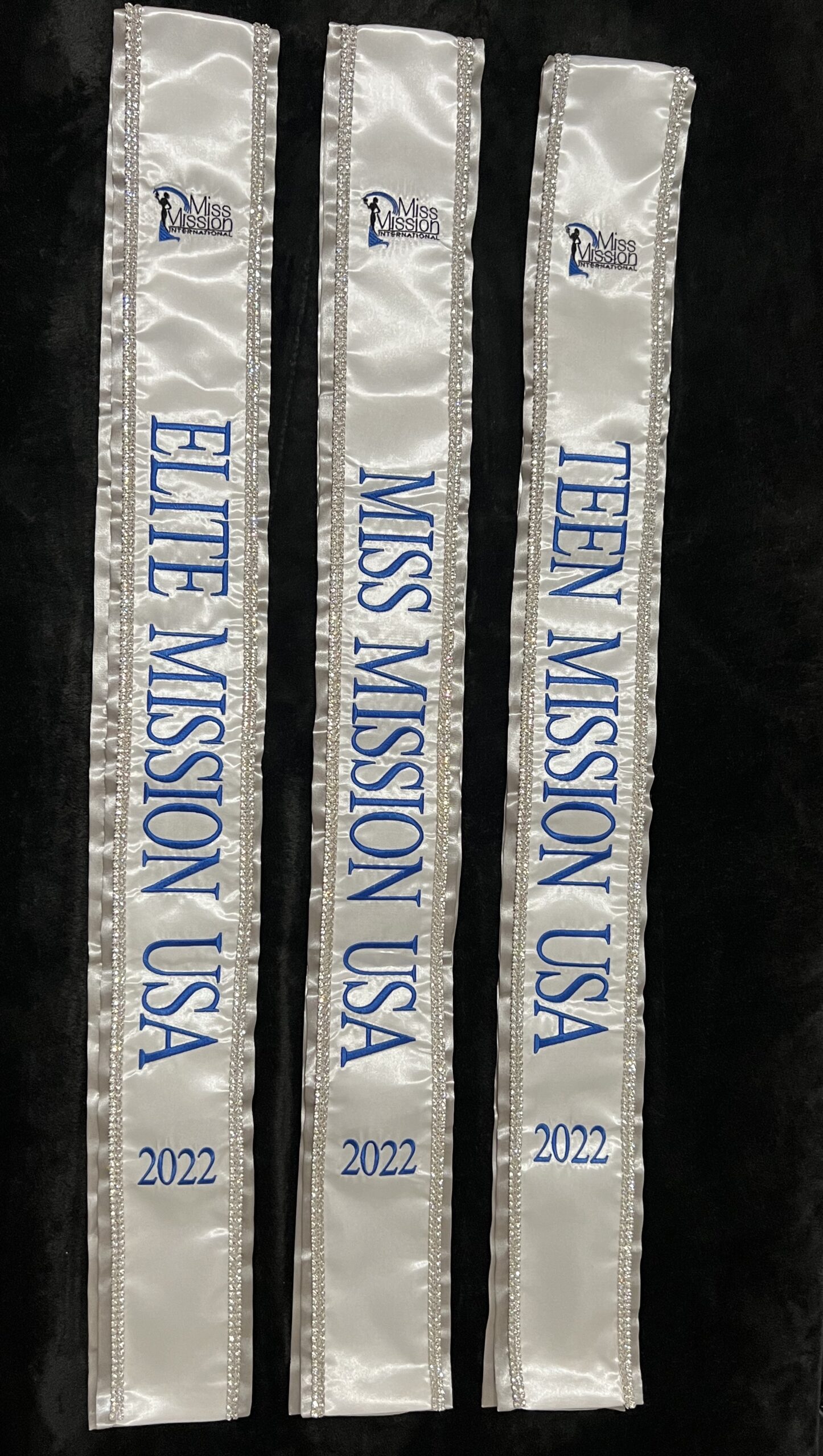 All regular sashes come with sewn on 2″ velcro squares. Rhinestones are sewn on, single strands are sewn into the seam so they don’t fall off and are always front and back, not just on the front.