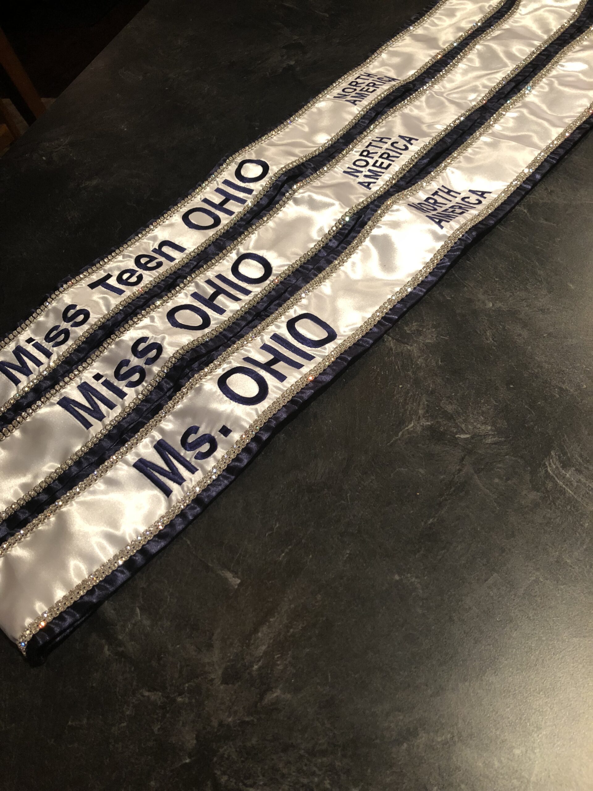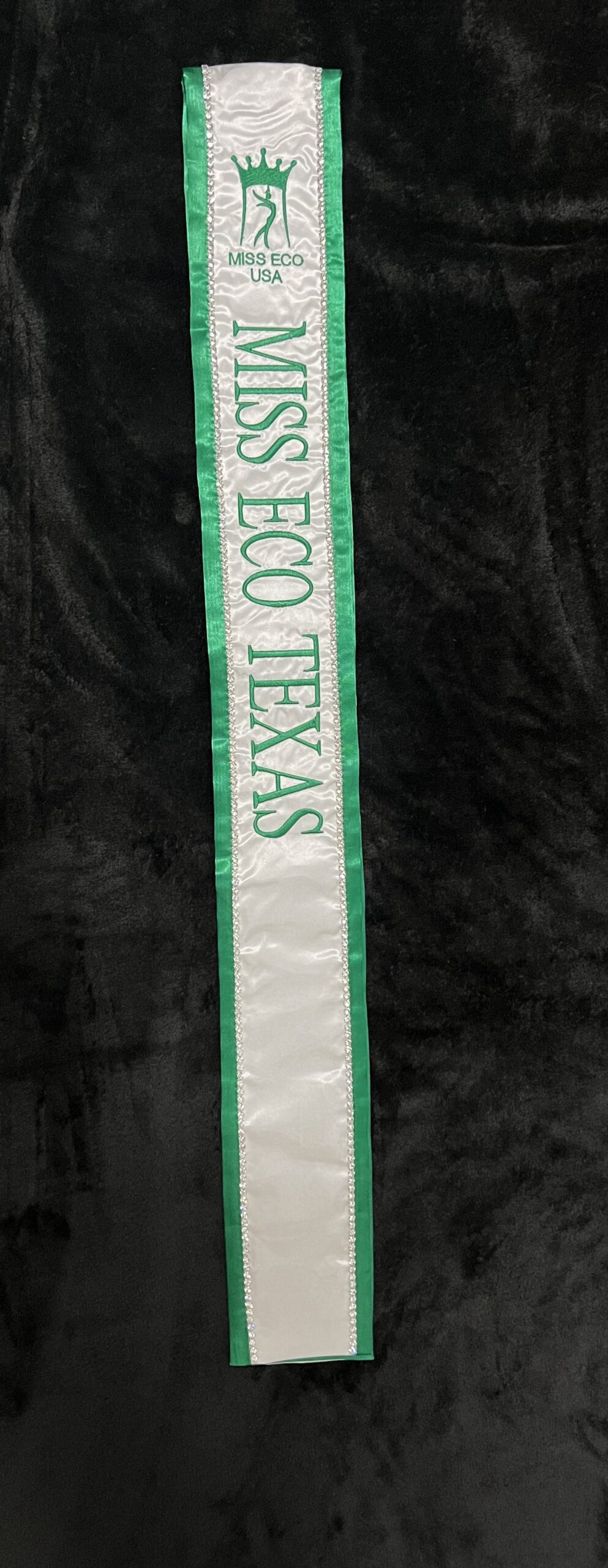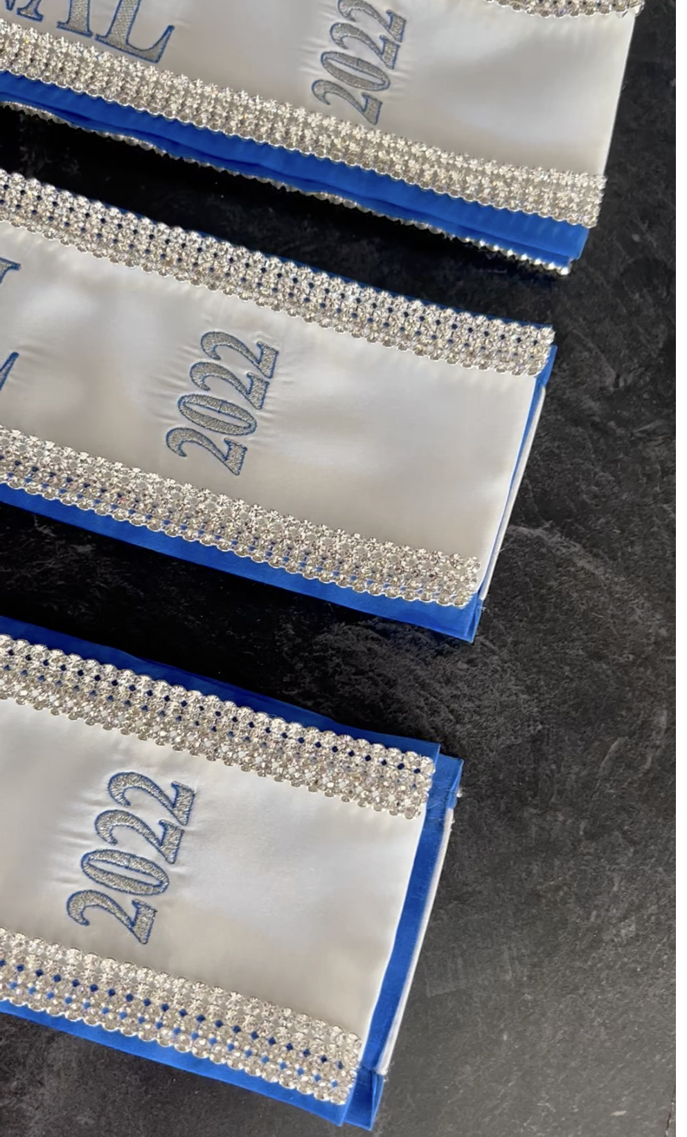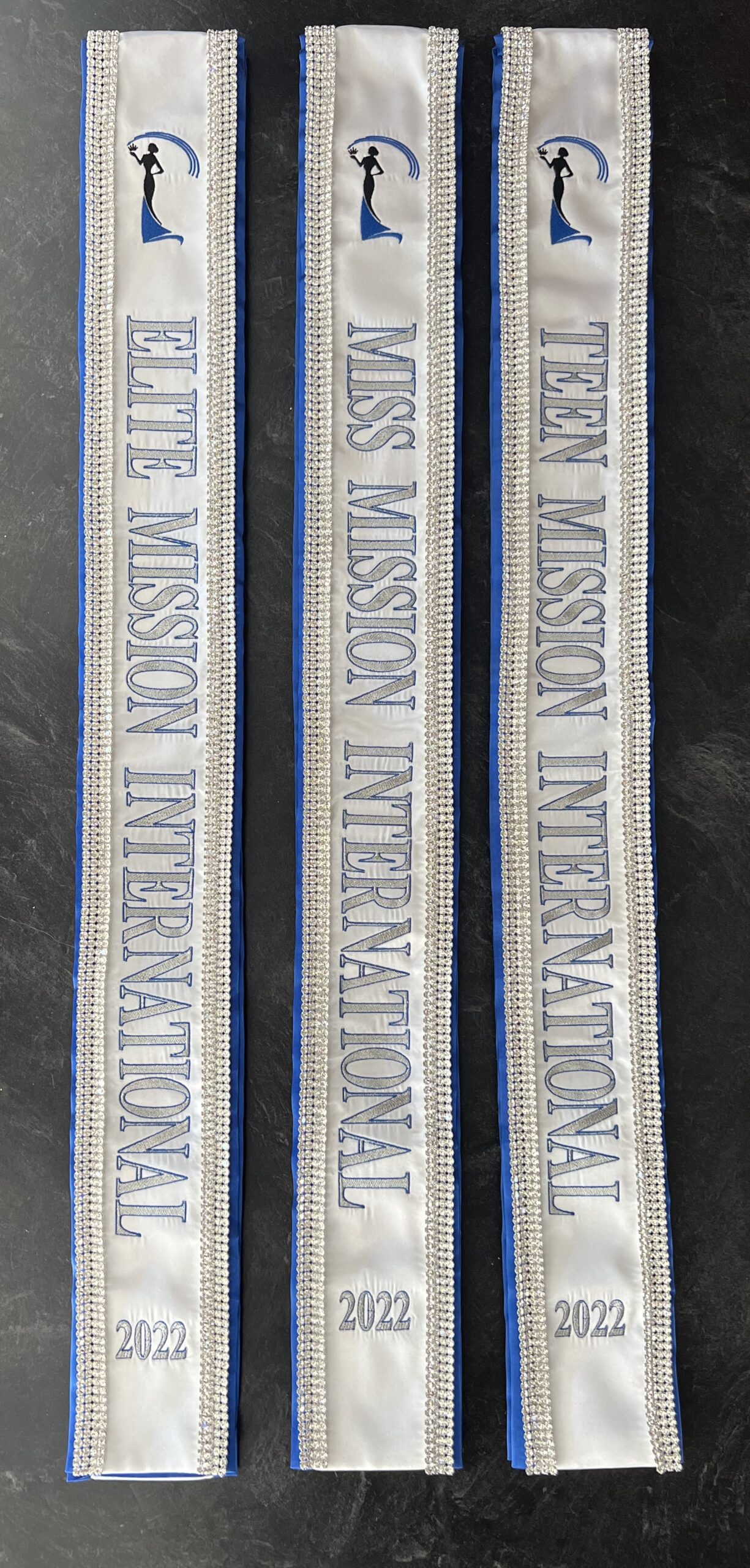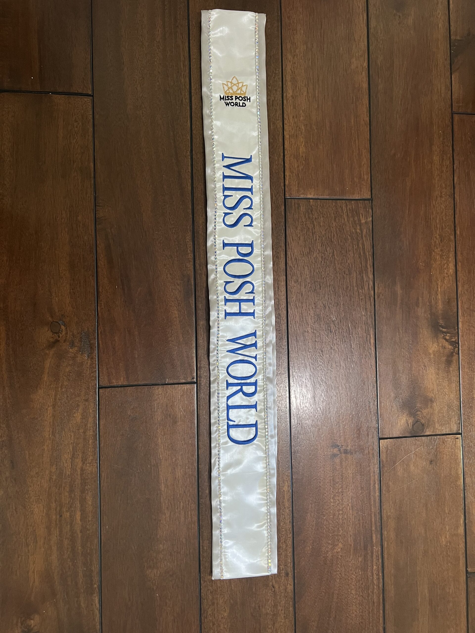 All regular sashes come with sewn on 2″ velcro squares. Rhinestones are sewn on, single strands are sewn into the seam so they don’t fall off and are always front and back, not just on the front.