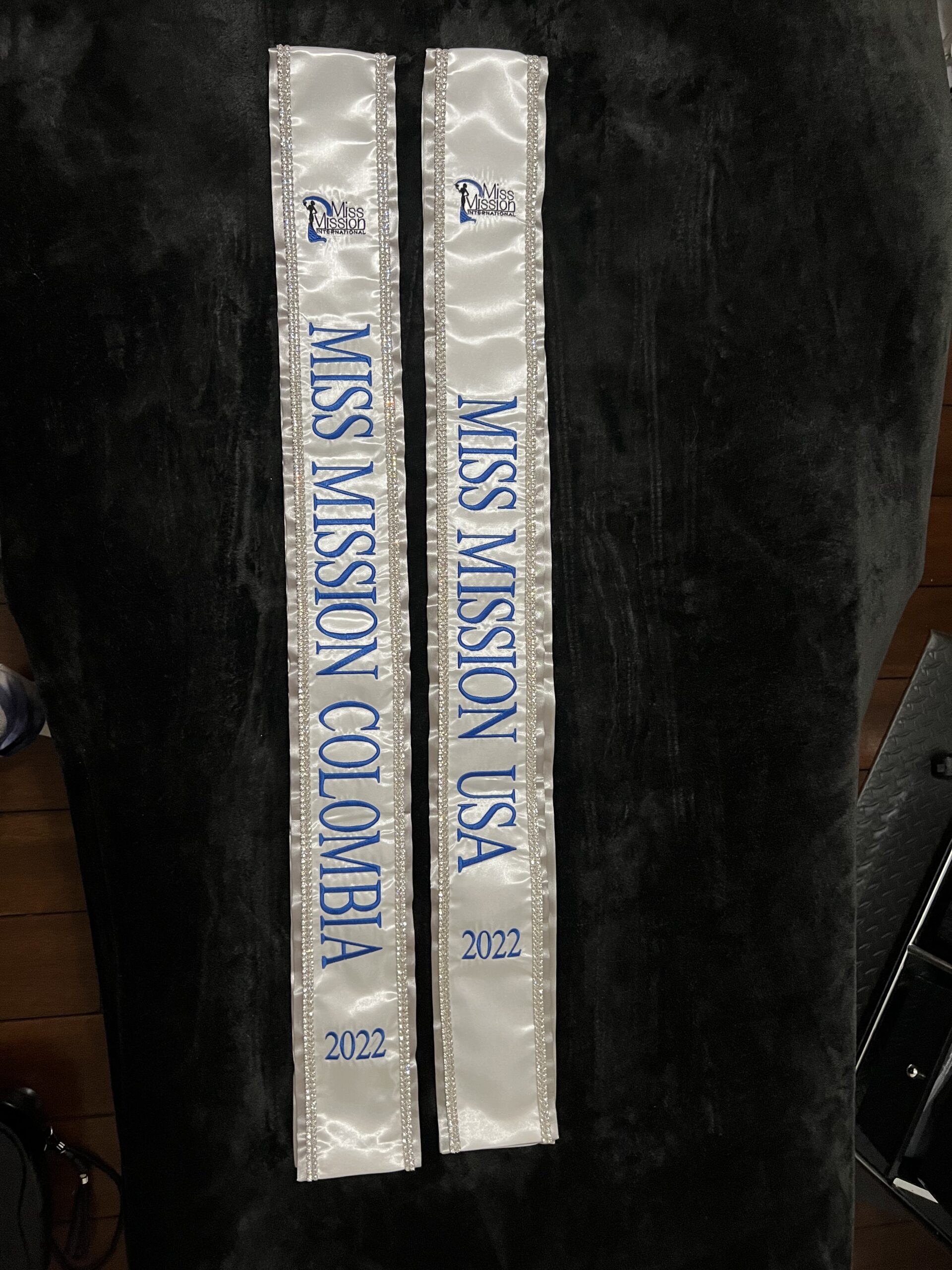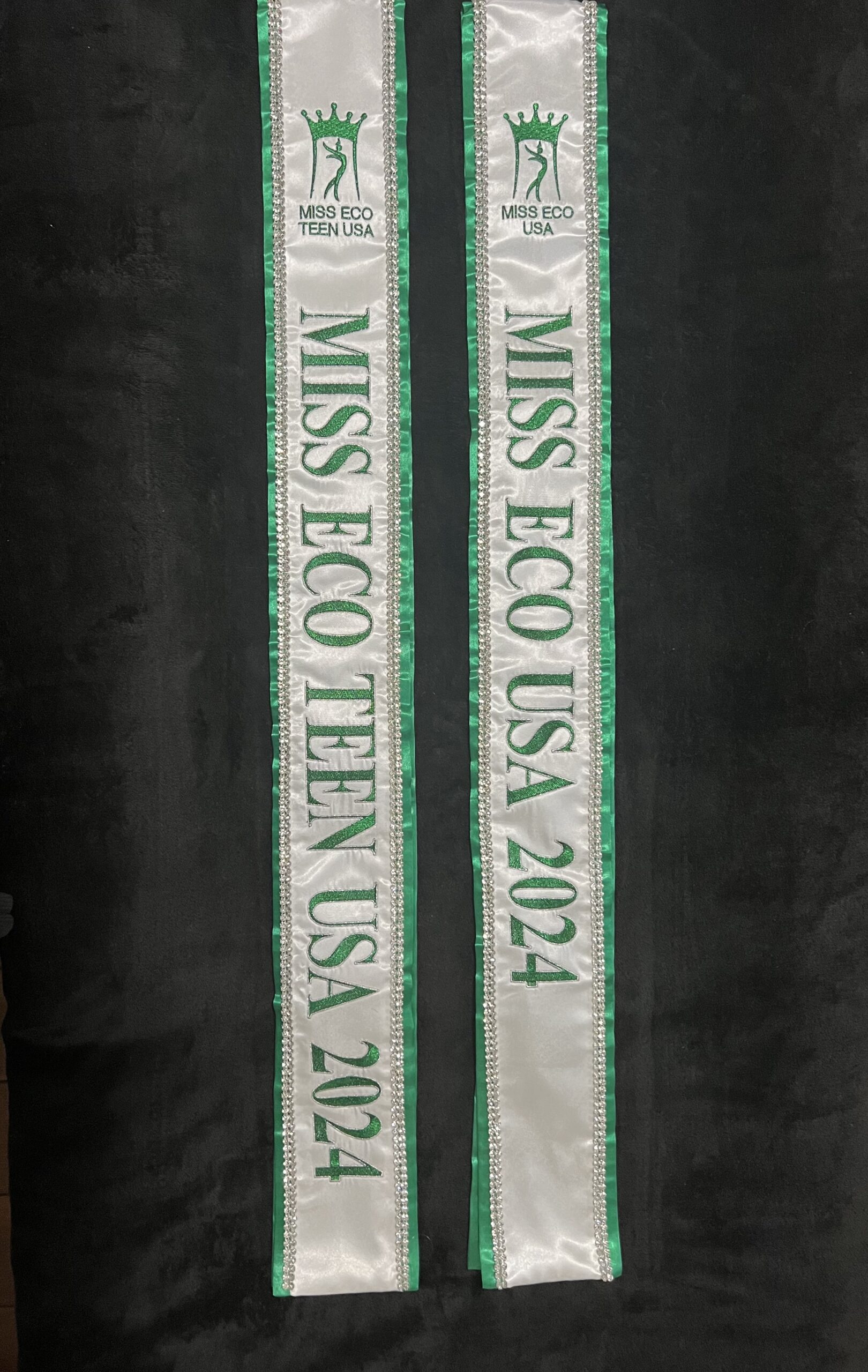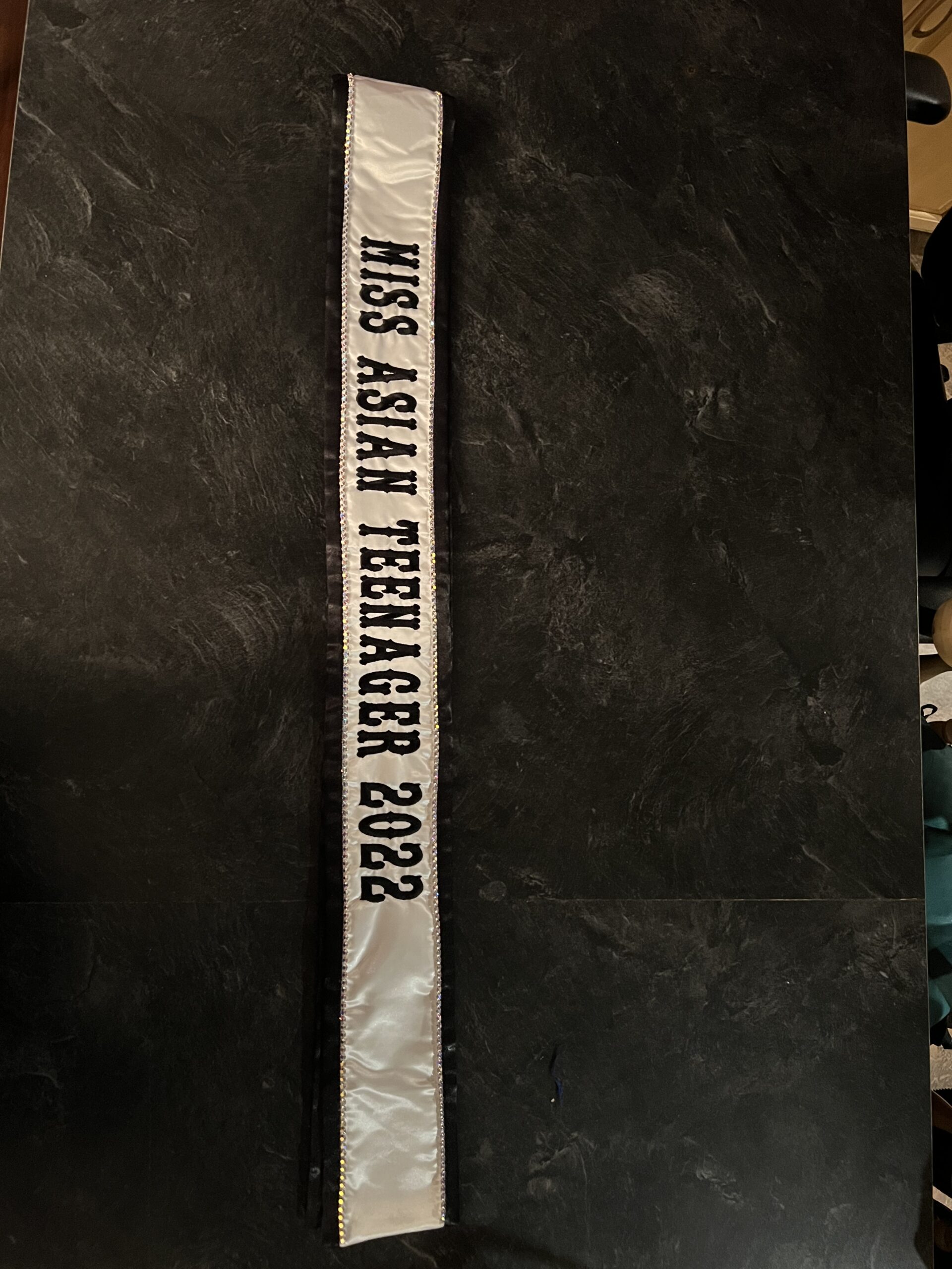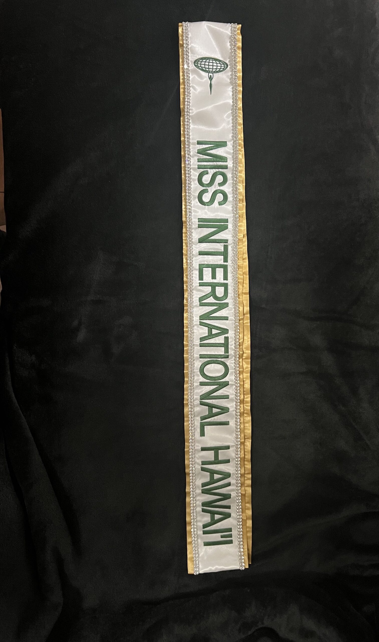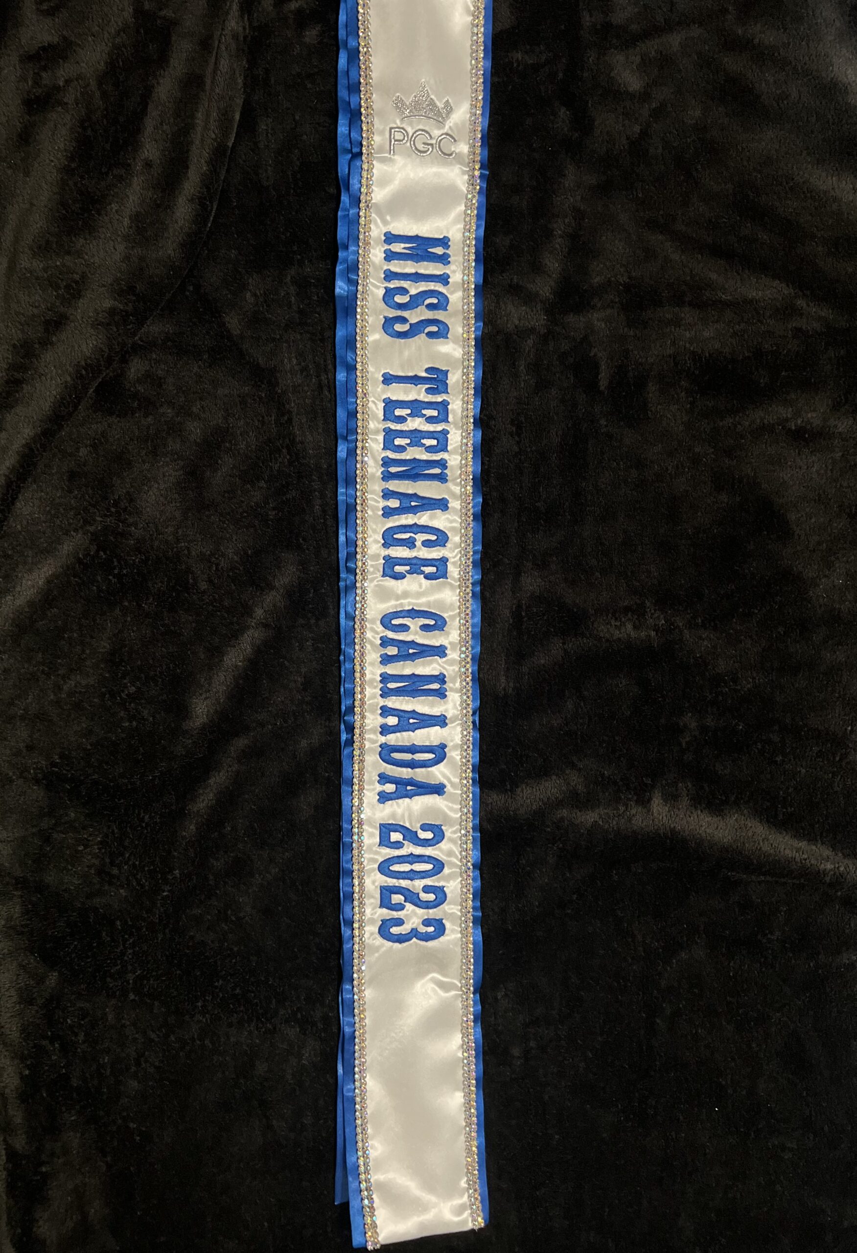 All regular sashes come with sewn on 2″ velcro squares. Rhinestones are sewn on, single strands are sewn into the seam so they don’t fall off and are always front and back, not just on the front.