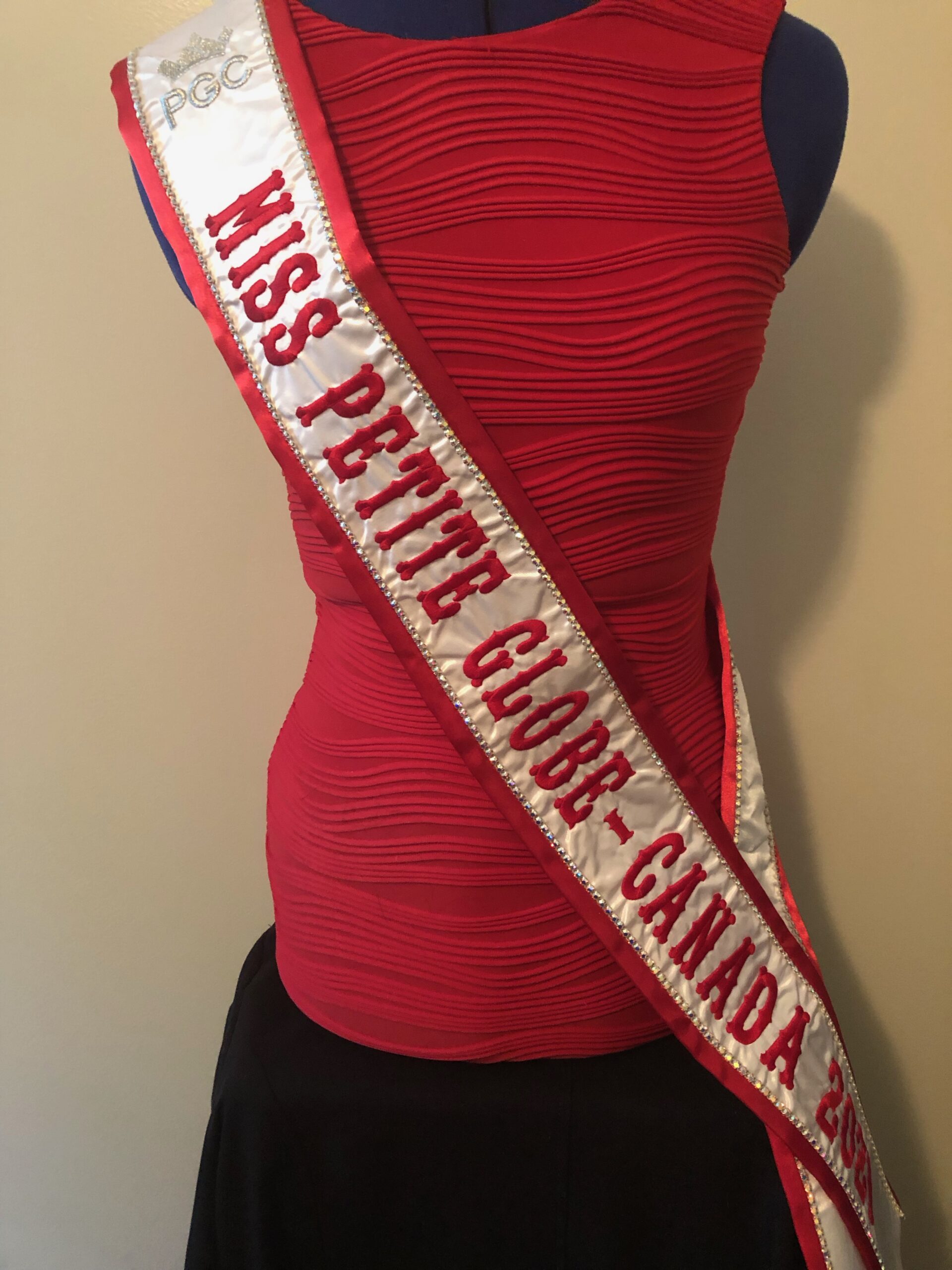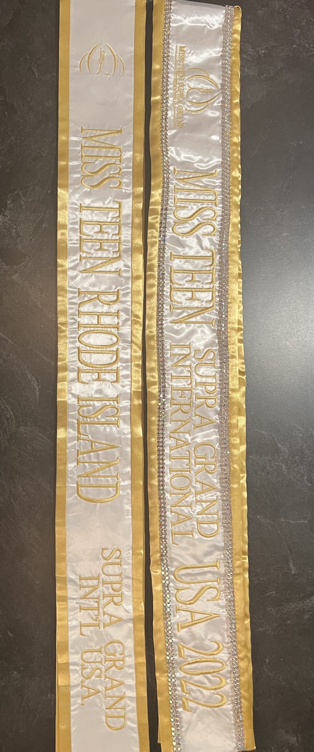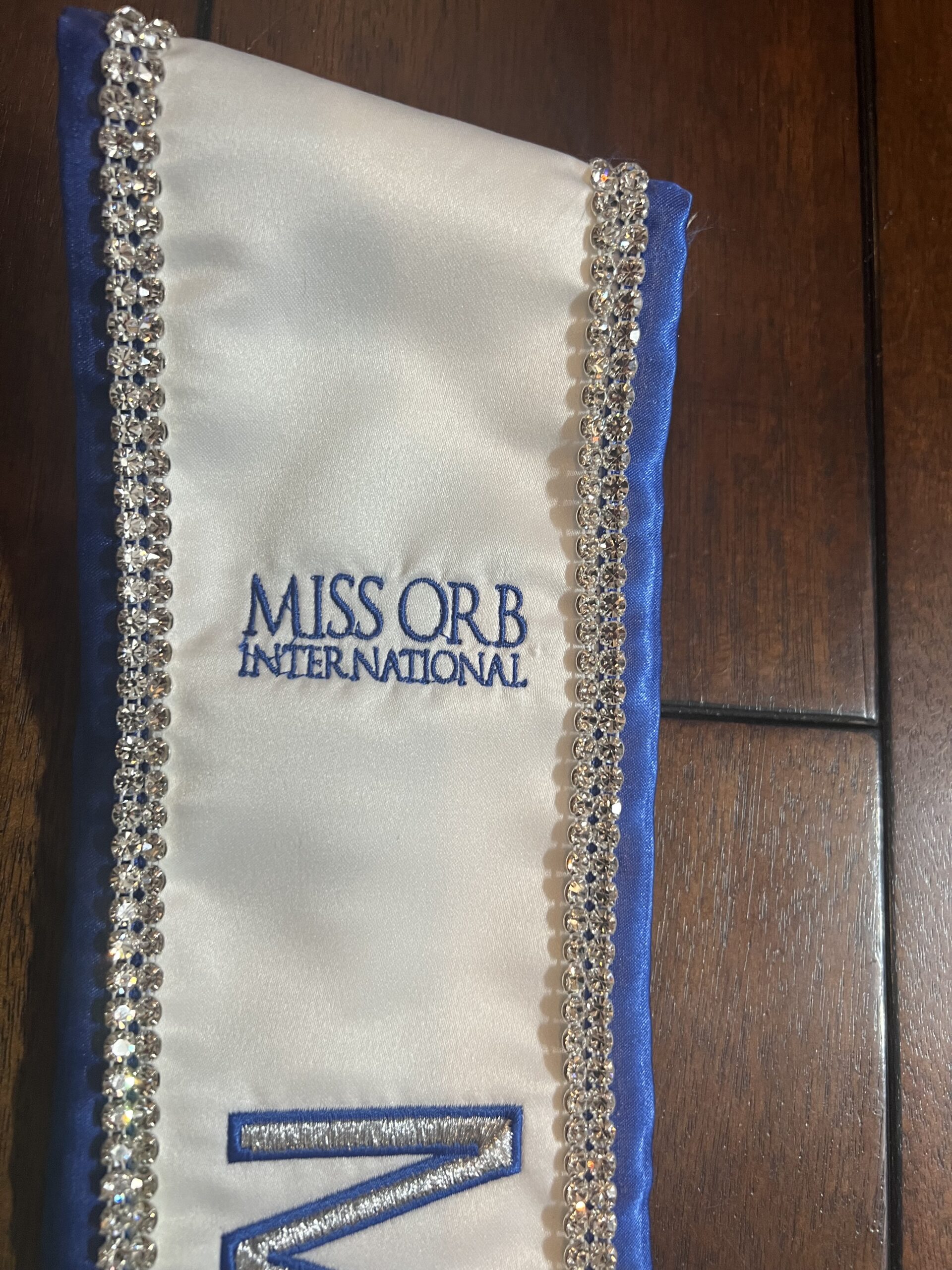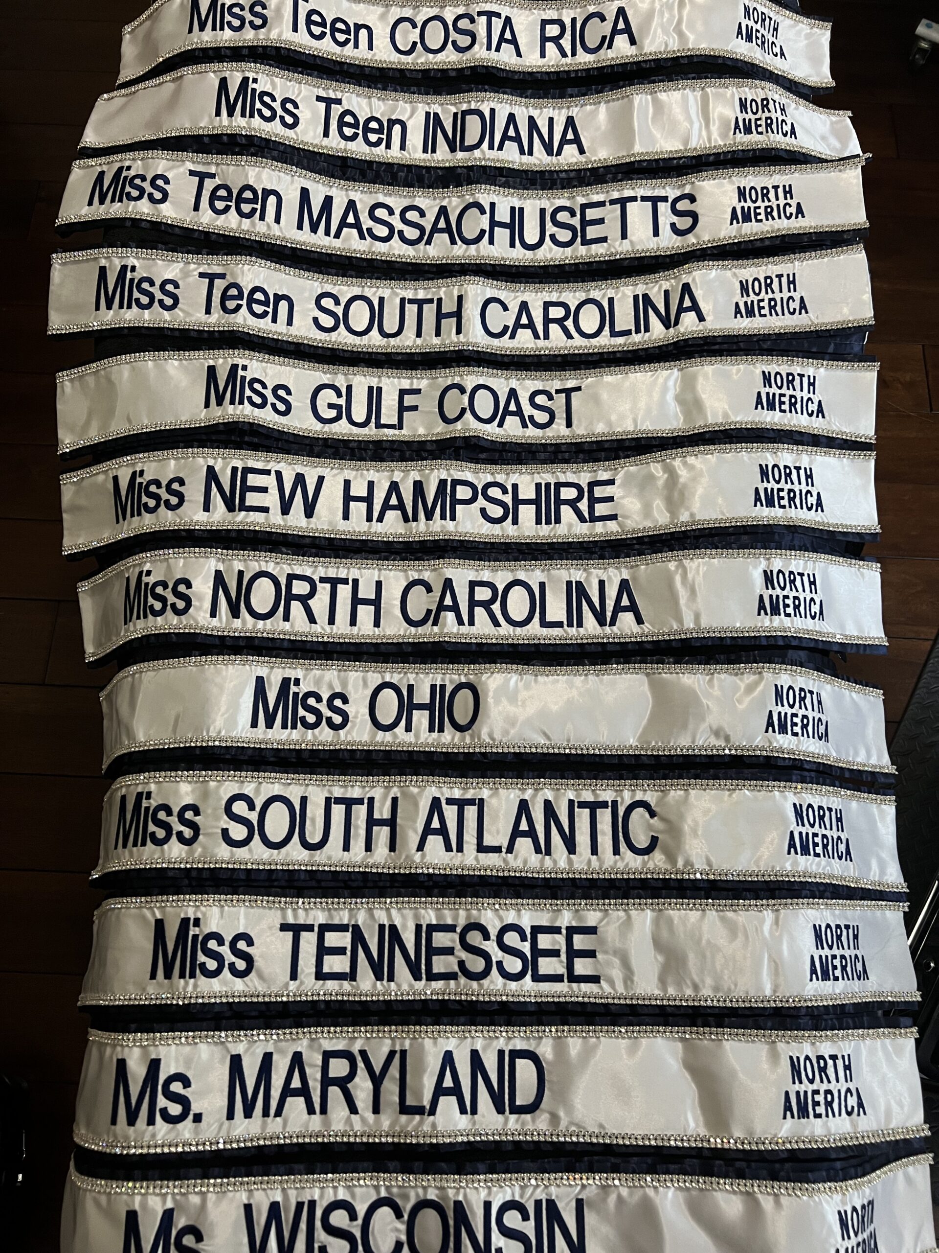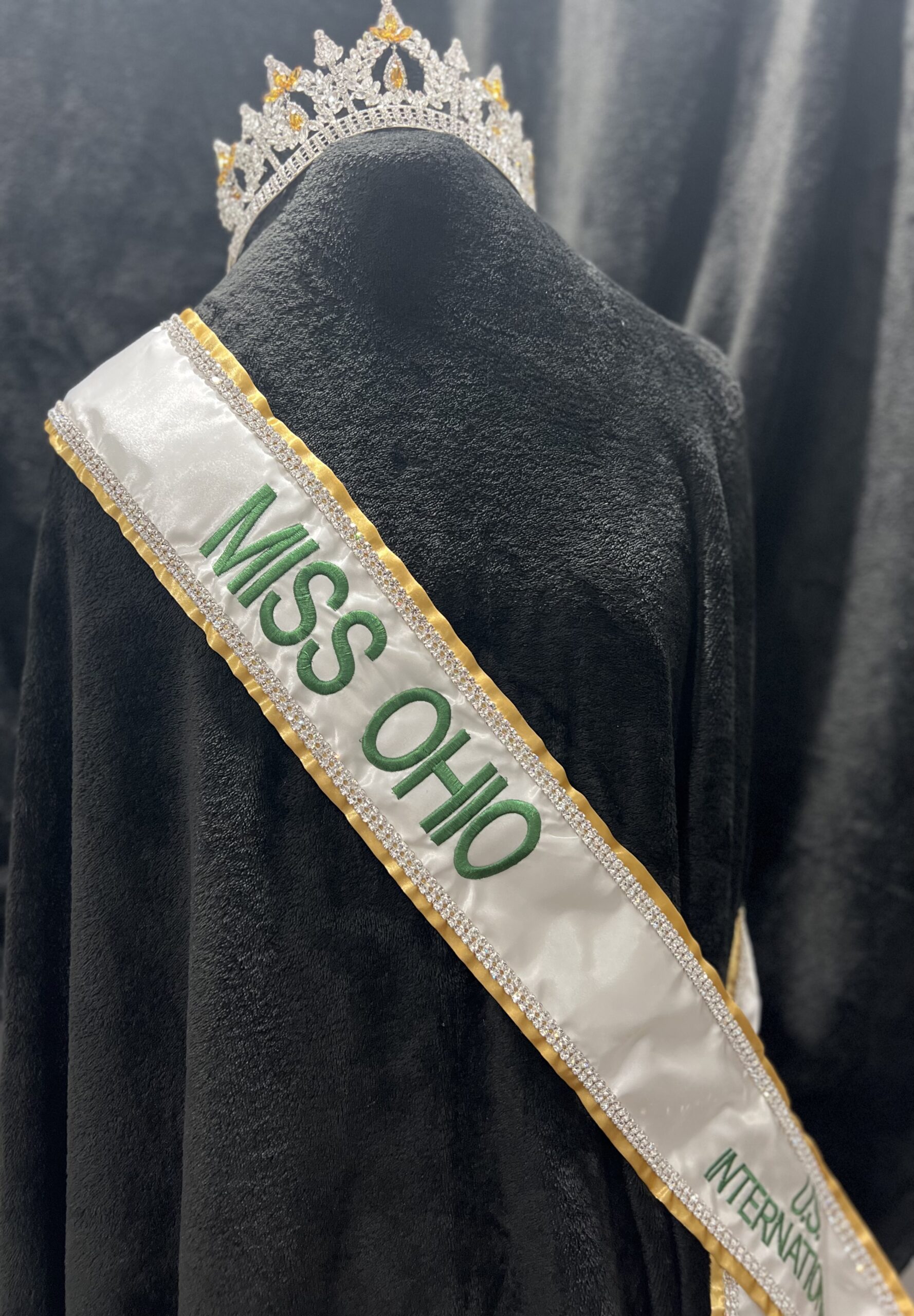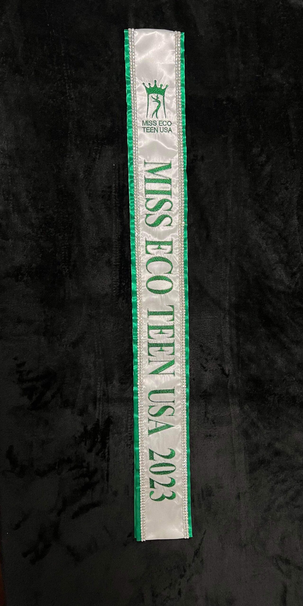 All regular sashes come with sewn on 2″ velcro squares. Rhinestones are sewn on, single strands are sewn into the seam so they don’t fall off and are always front and back, not just on the front.
