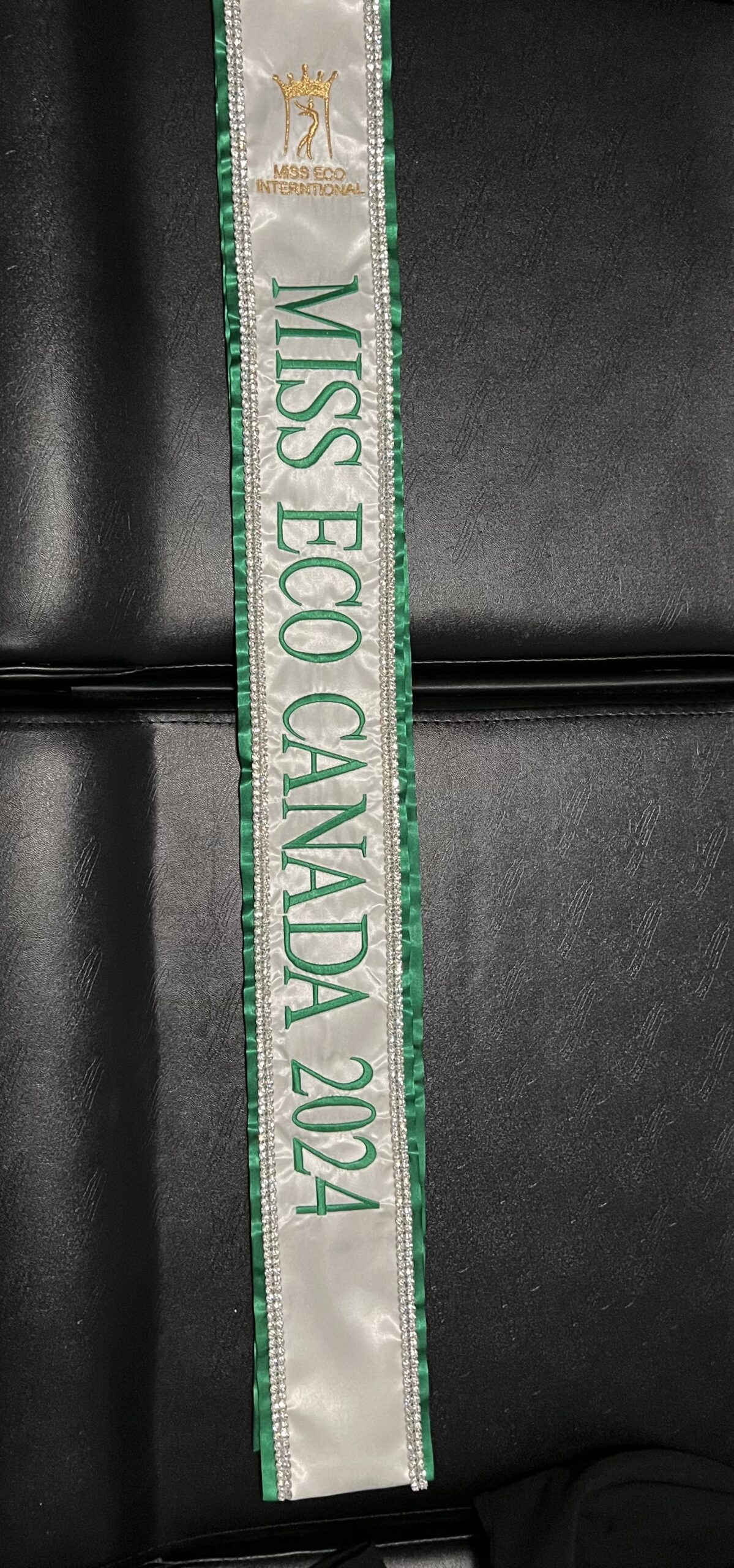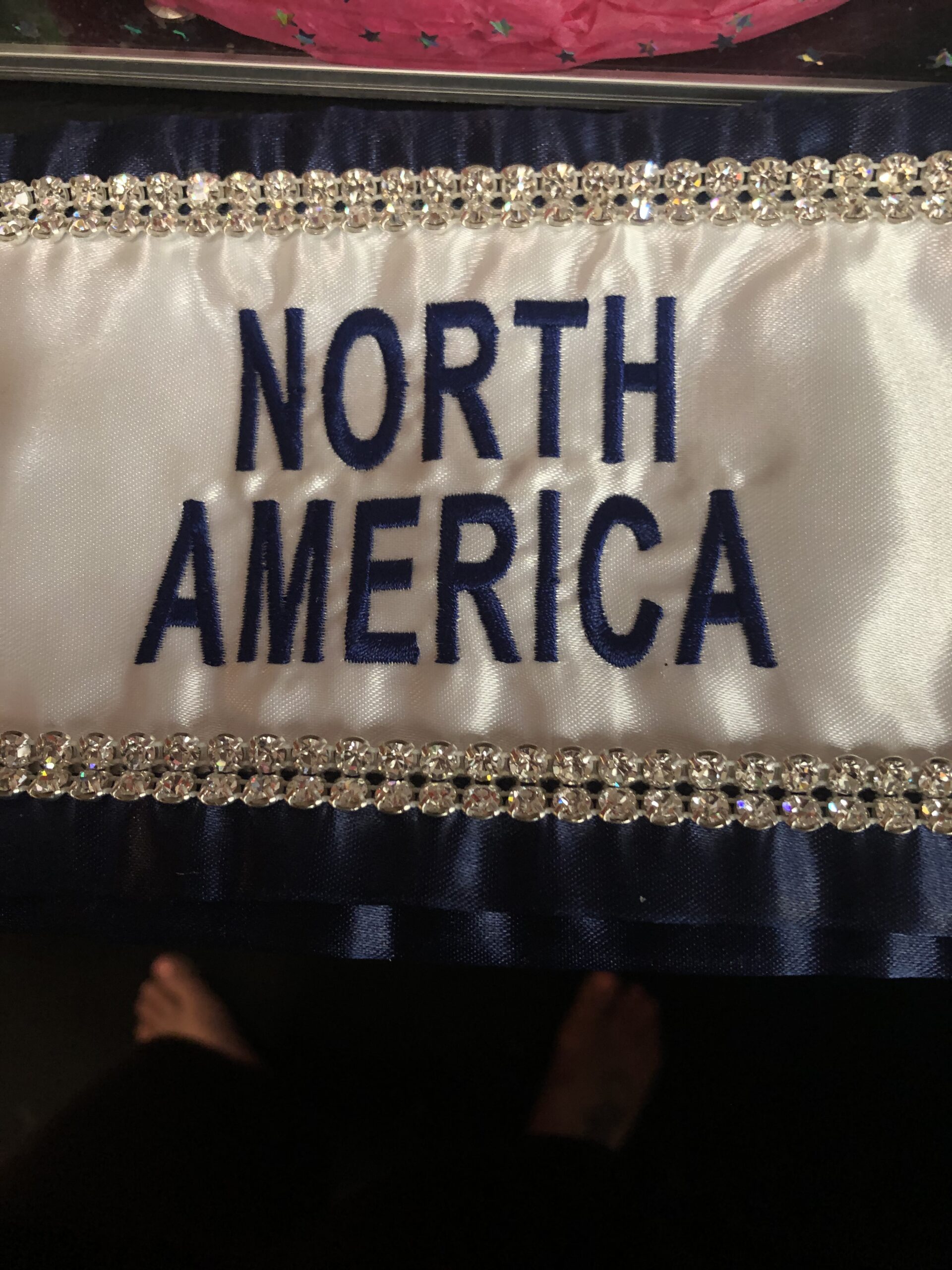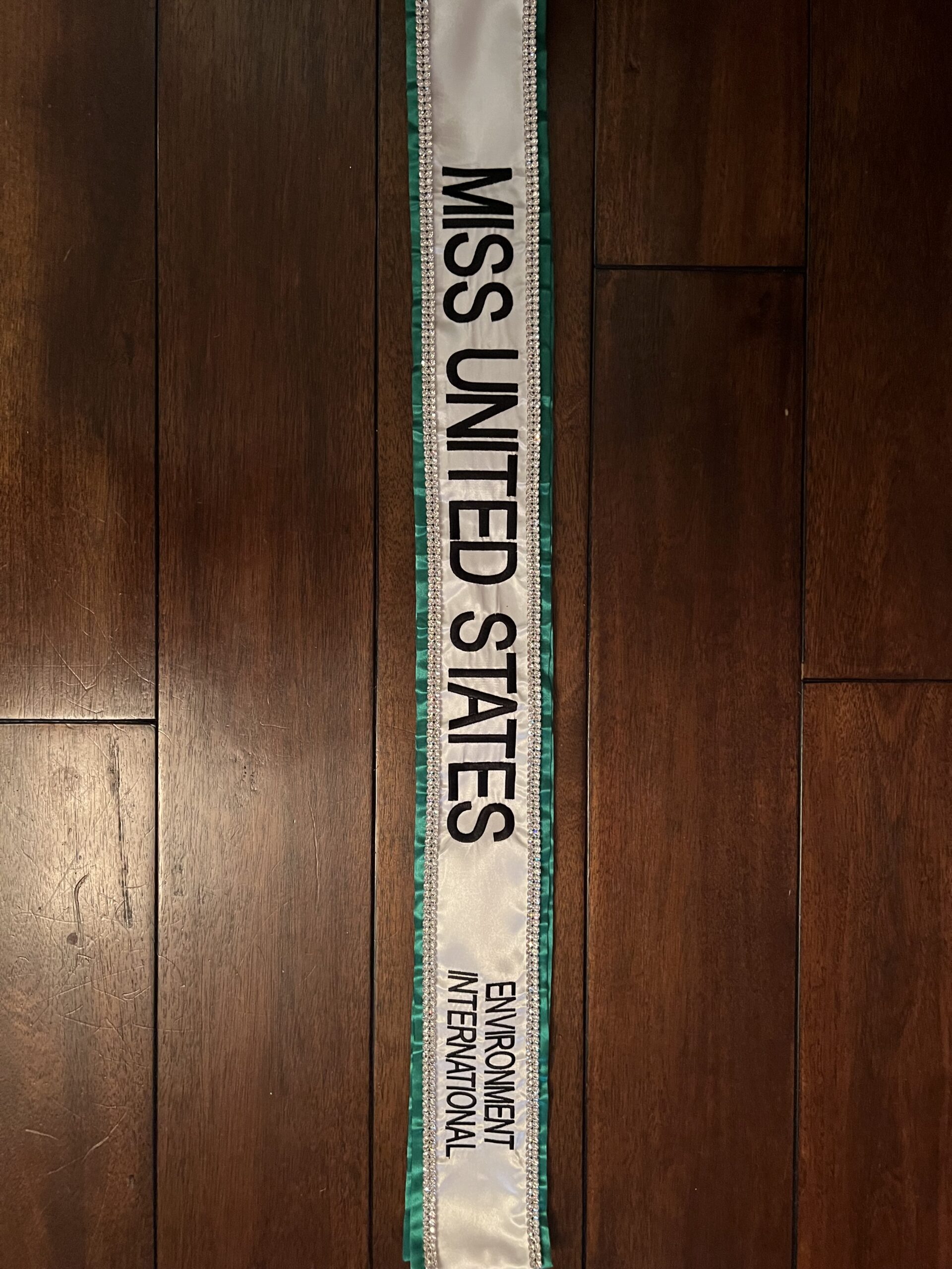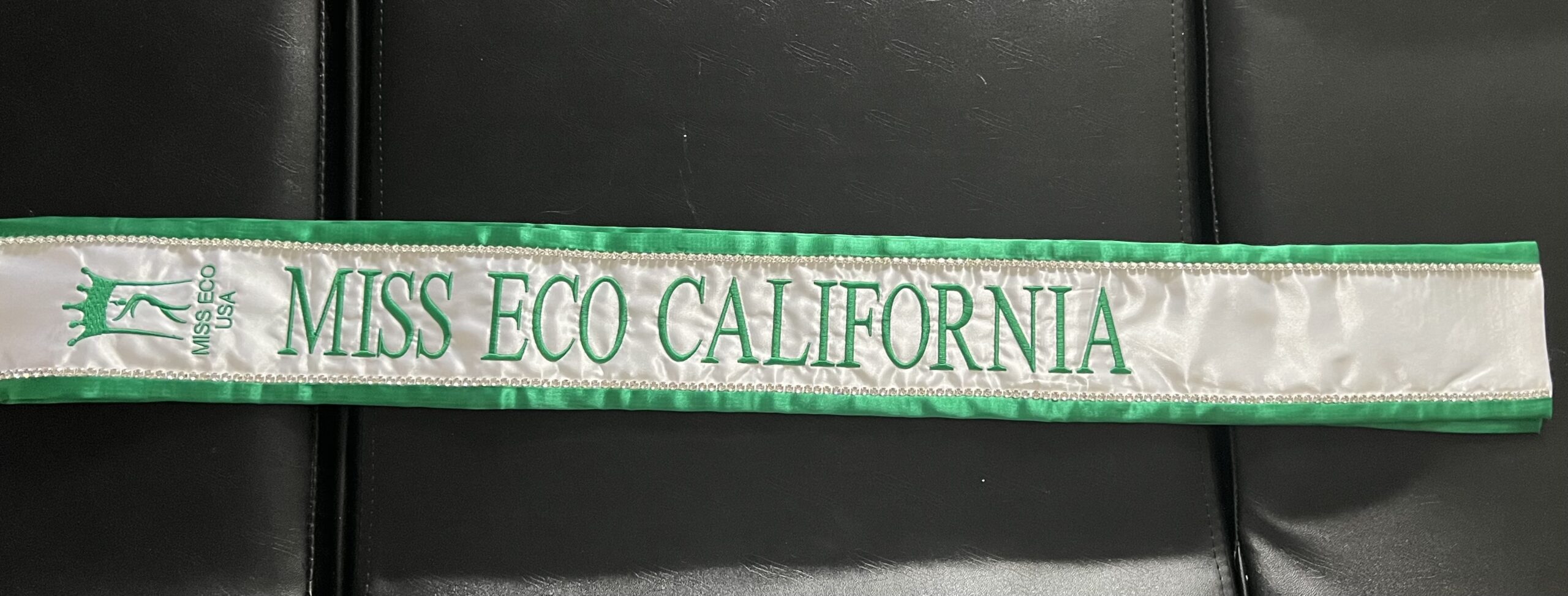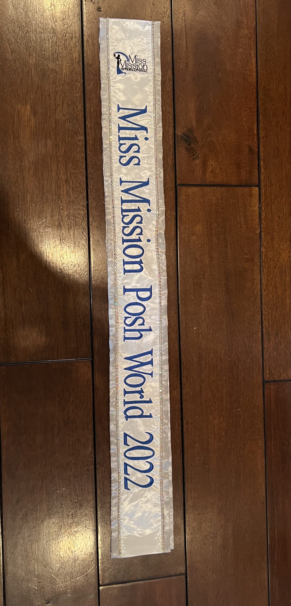 All regular sashes come with sewn on 2″ velcro squares. Rhinestones are sewn on, single strands are sewn into the seam so they don’t fall off and are always front and back, not just on the front.