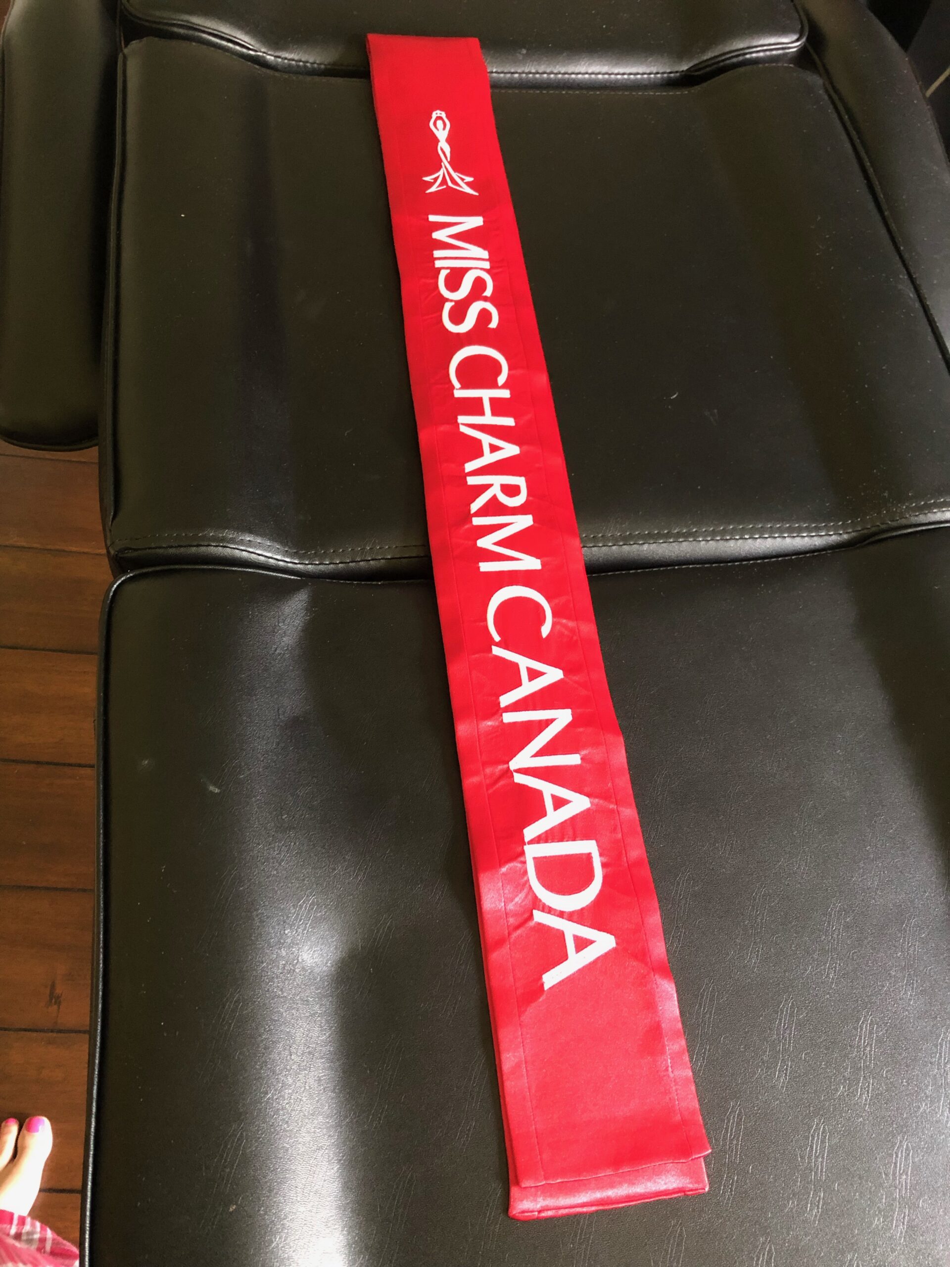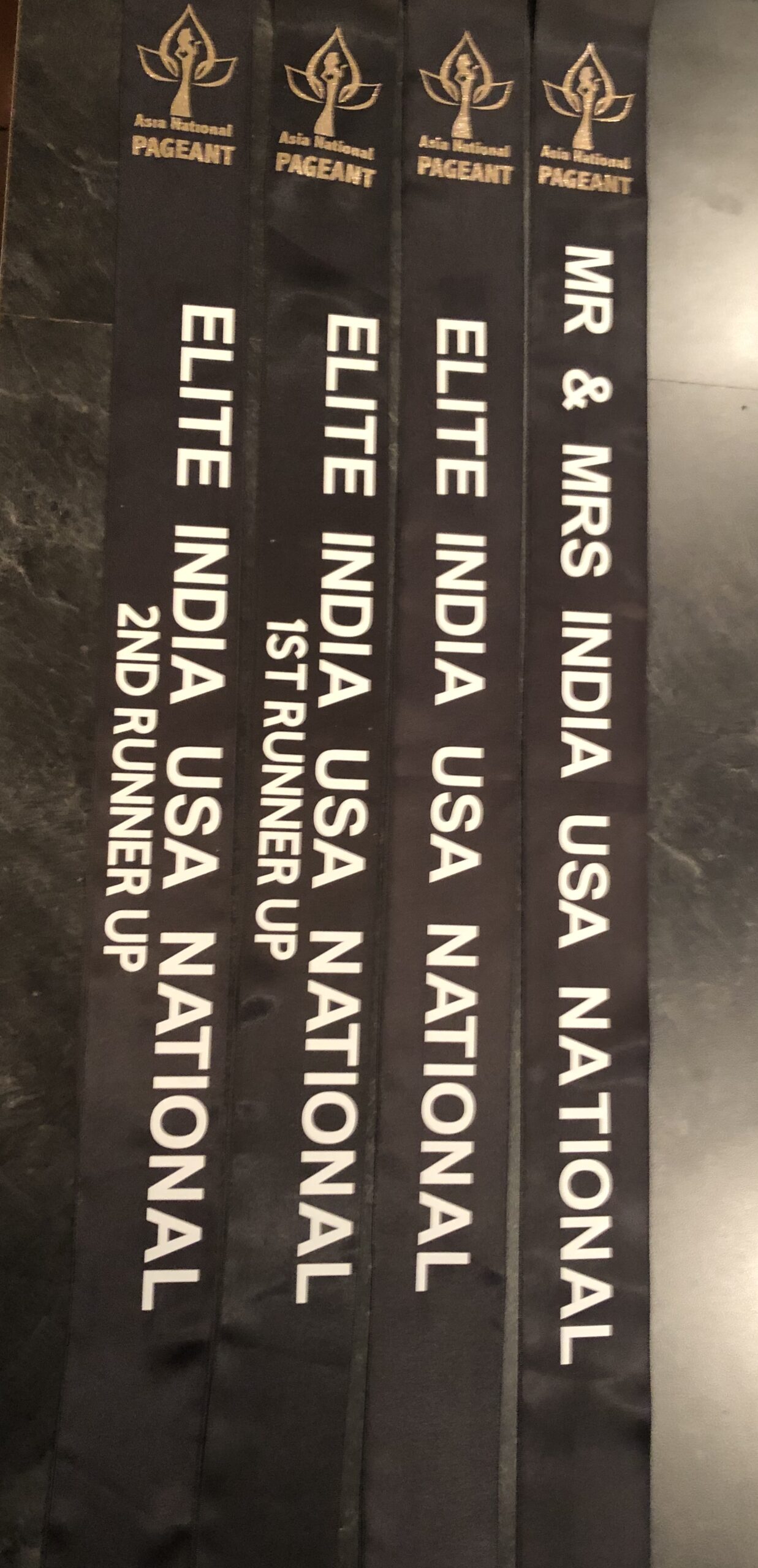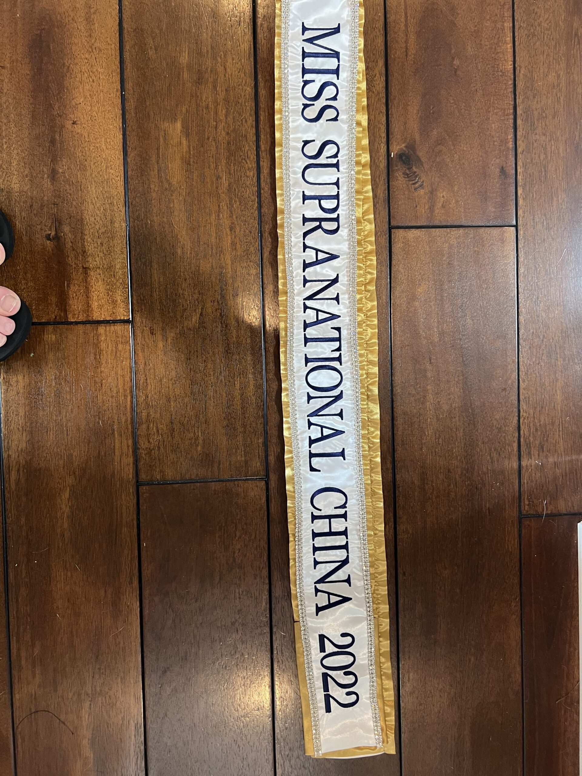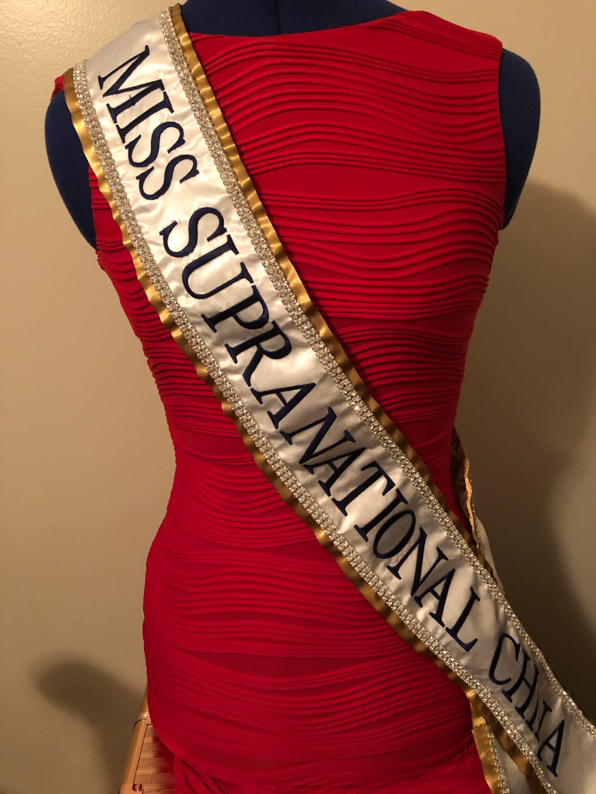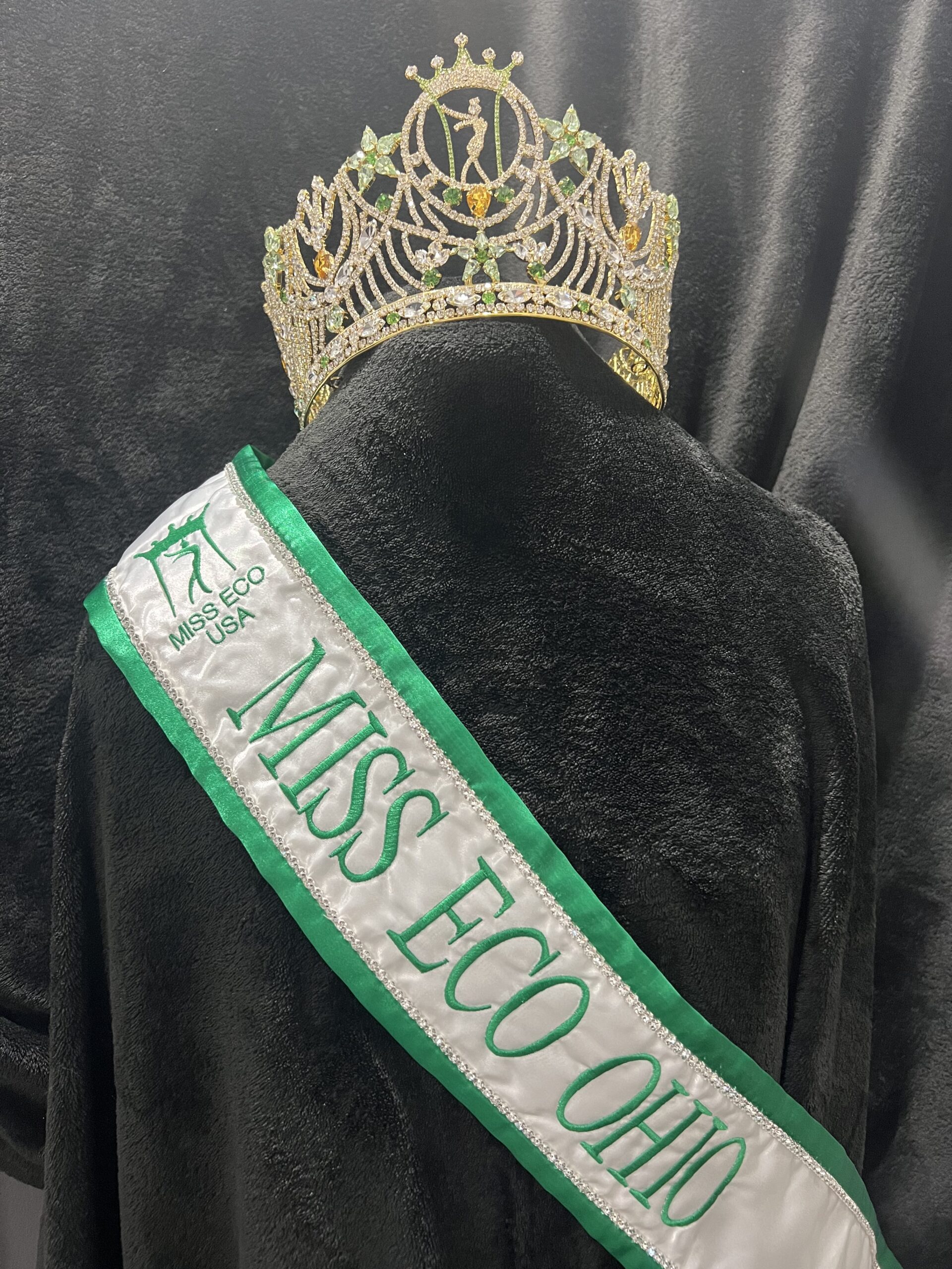 All regular sashes come with sewn on 2″ velcro squares. Rhinestones are sewn on, single strands are sewn into the seam so they don’t fall off and are always front and back, not just on the front.